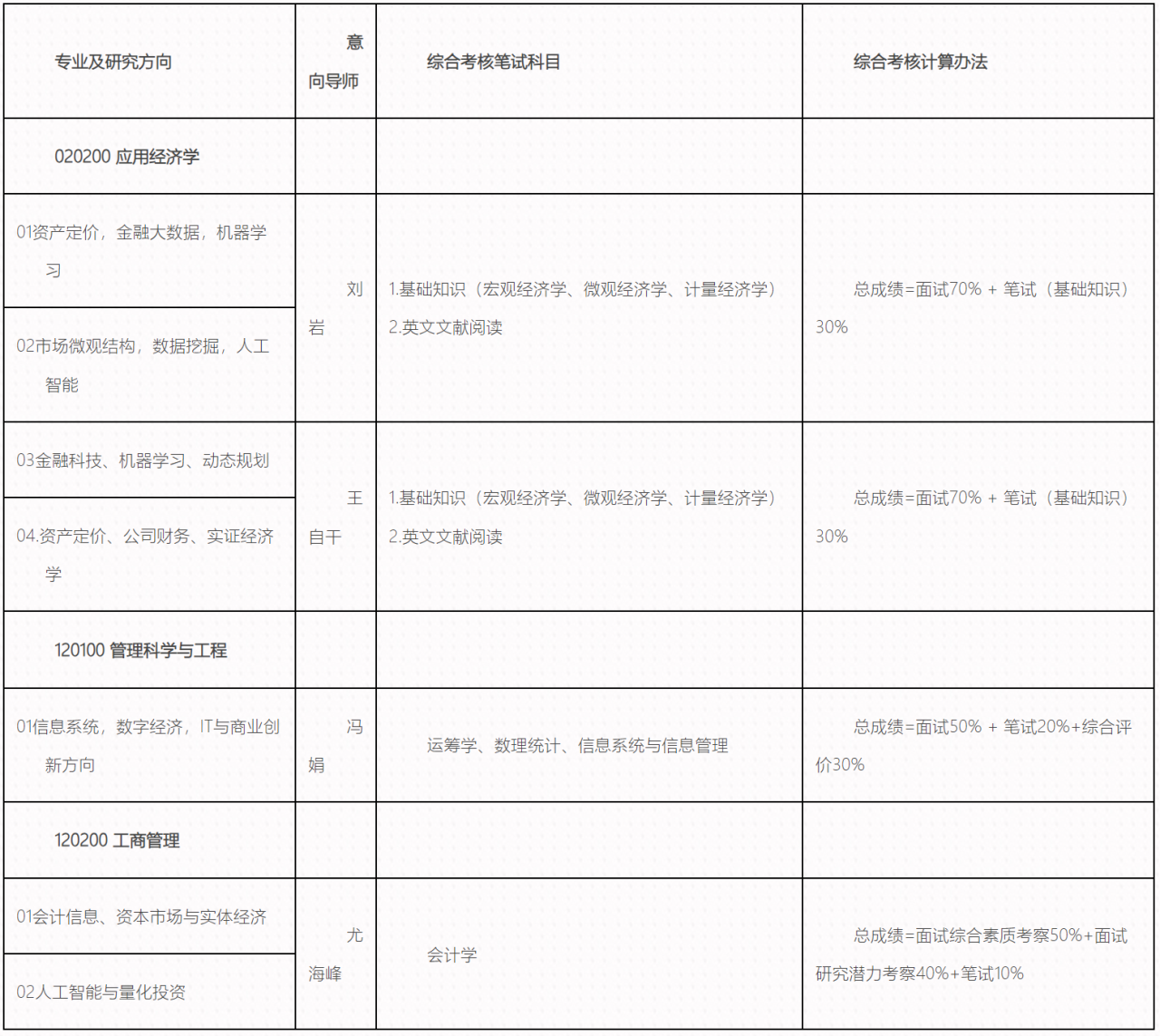 专业及研究方向、综合考核笔试科目及综合考核计算办法: