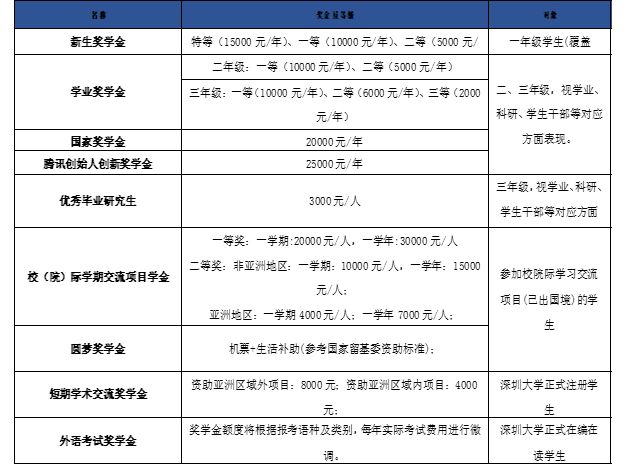 受益于深圳良好经济发展优势和对学校的大力支持,学院研究生在校期间表现优秀可获得多种奖助学金,包括国家助学金、新生奖学金、学业奖学金、社会奖学金、三助酬金和境外学习奖学金等。按照我校奖助体系,研究生每年最低可获得学校8000元的奖助学金。更多详情请参考: